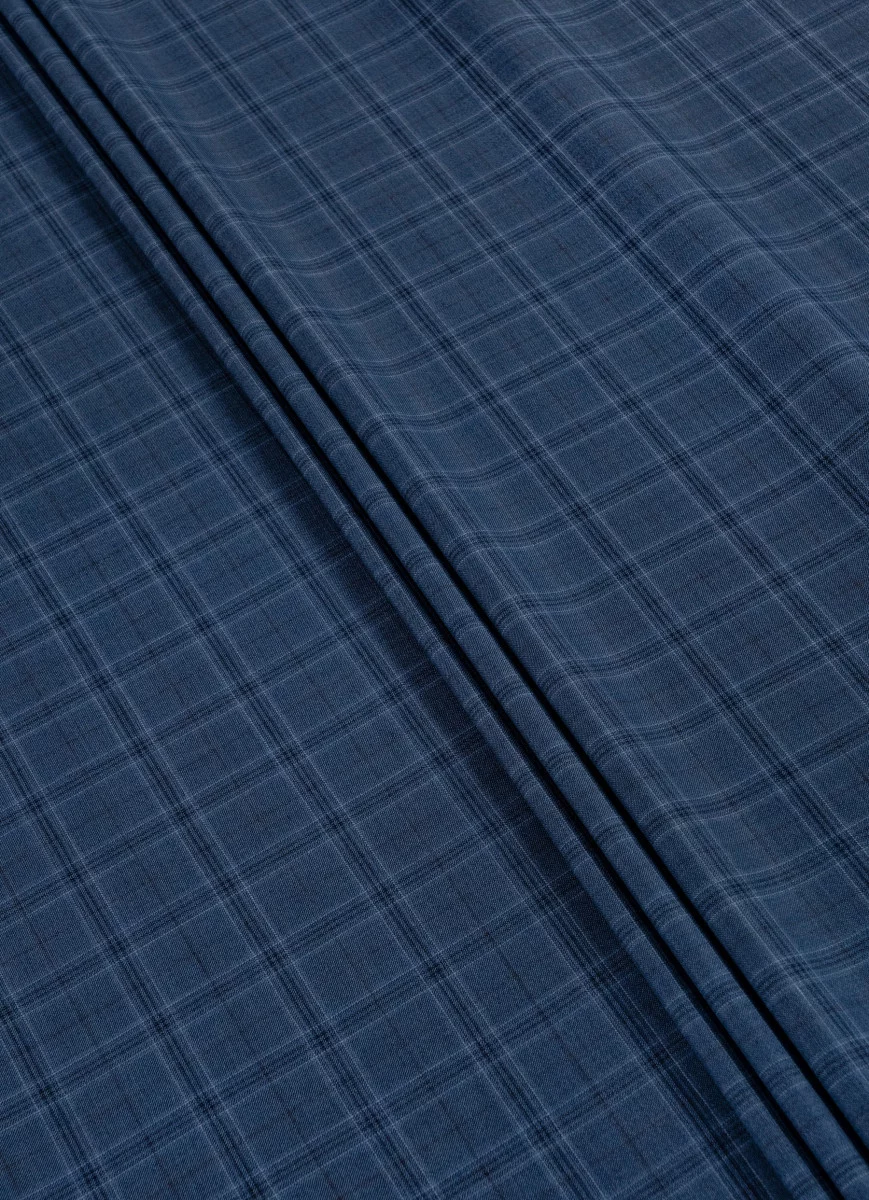 Olasz jelmez gyapjú világos sötétkék színben, 5 cm széles ellenőrző motívummal. Puha, nem rugalmas anyag, klasszikus szövéssel.