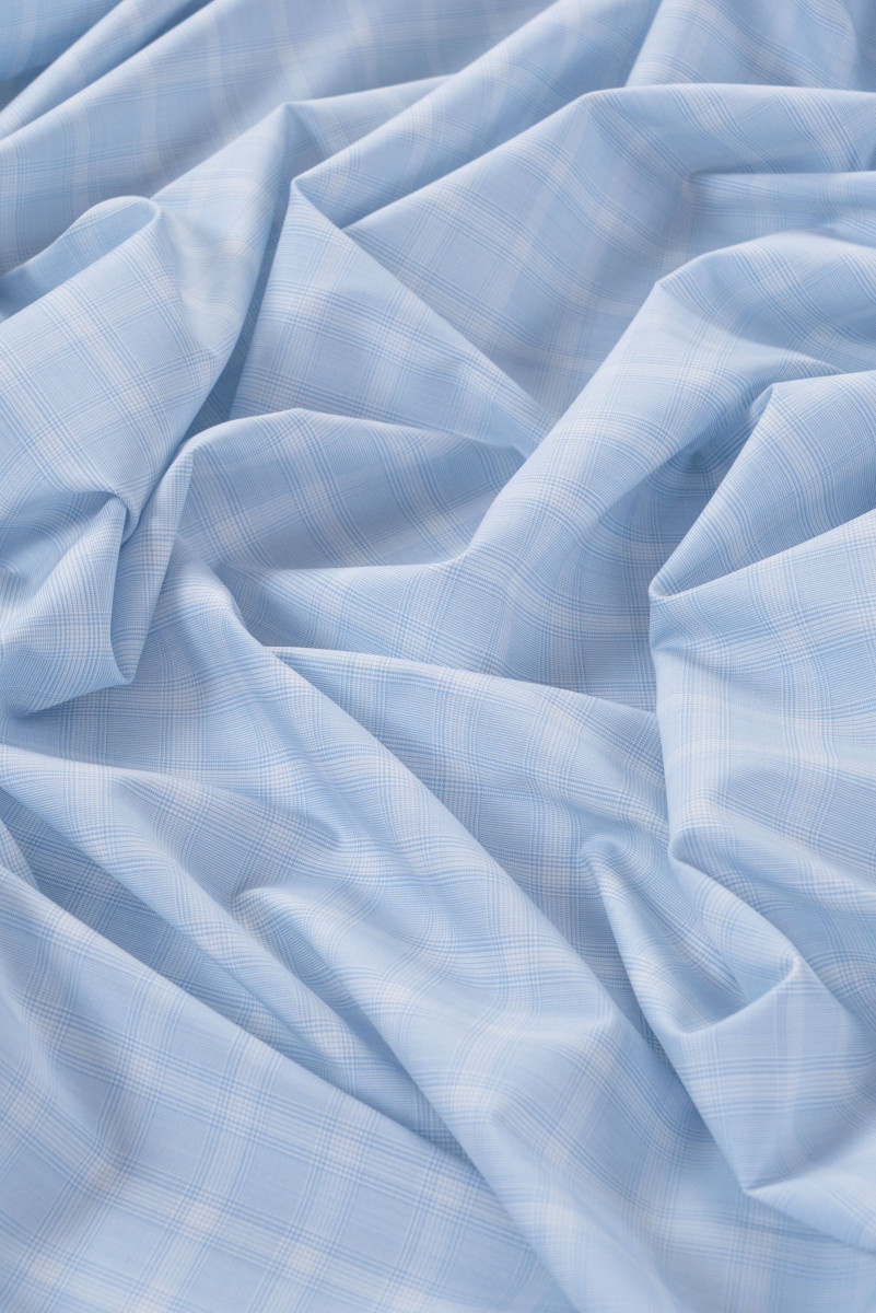 Olasz jelmez gyapjú kék színben, 5 cm széles ellenőrző motívummal. Vékony, nem rugalmas anyag, klasszikus szövéssel.