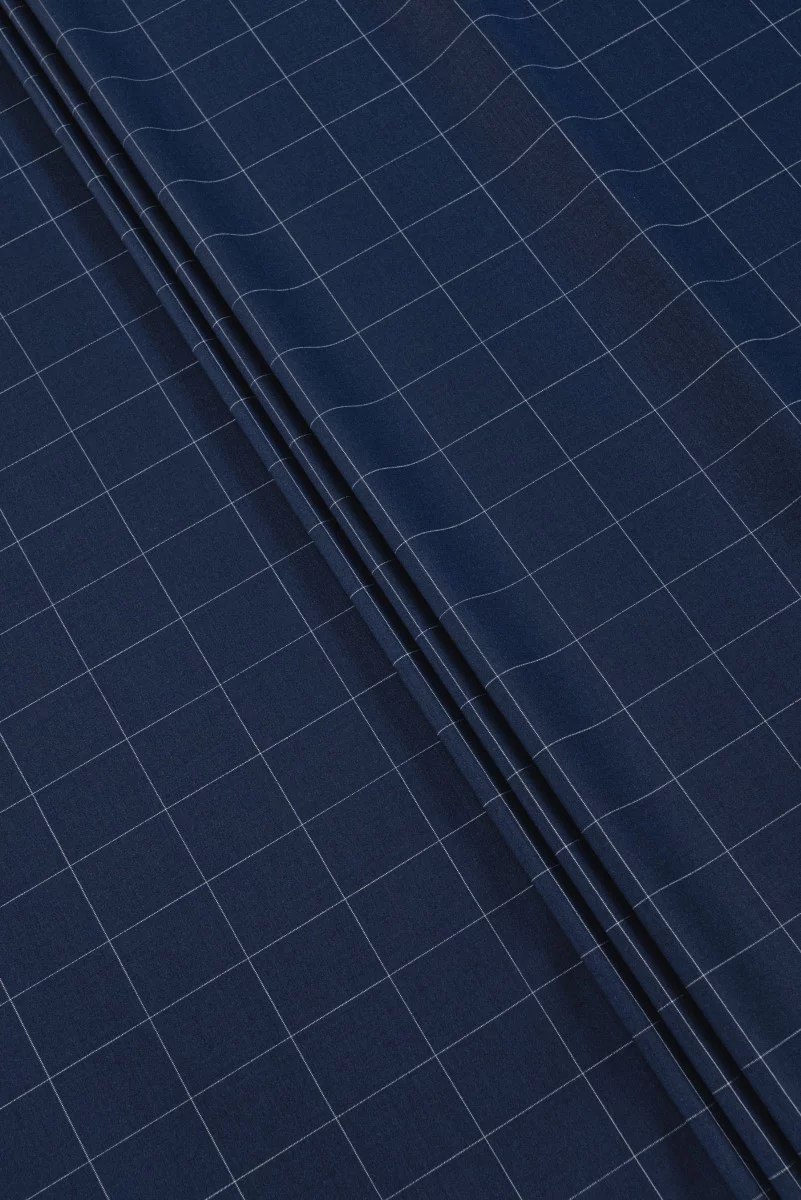 Olasz jelmez gyapjú sötétkék színben, fehér ellenőrző motívummal, 5 cm * 4 cm méretű. Közepes vastagságú, rugalmas anyag - tökéletes ruha, szoknya, öltöny, nadrág varrásához.