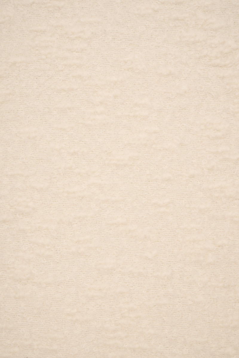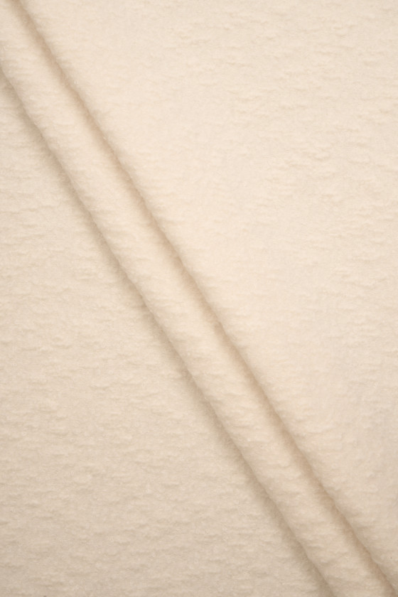 Olasz boucle kabátszövet ecru színben. Vastagabb, húsos, jellegzetes textúrájú anyag, természetes gyapjúból, alpakából és poliamidból szőtt. Tökéletes felsőruházathoz, például kabáthoz, kabáthoz, mellényhez. Vegytisztítás ajánlott.