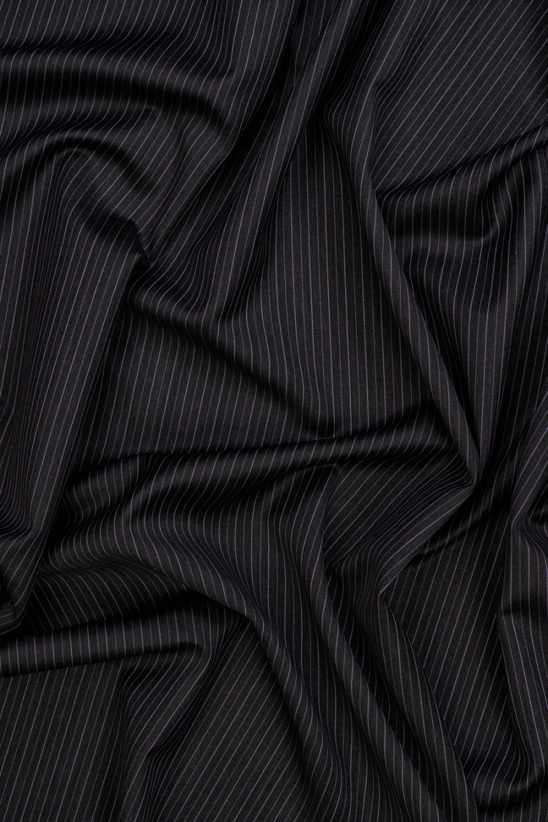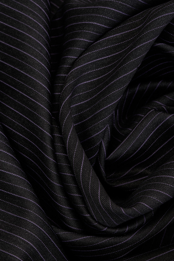 Olasz jelmezszövet gyapjúból és selyemből szőtt sötét grafitban, vékony csíkokkal, lila színben. A két szélességű csíkokat (minimális különbség) felváltva elosztva és 5 mm-enként elosztva helyezzük el. A szövet puha, húsos, nem rugalmas. Tökéletes jelmez, öltöny, nadrág, szoknya, ruha varrásához.