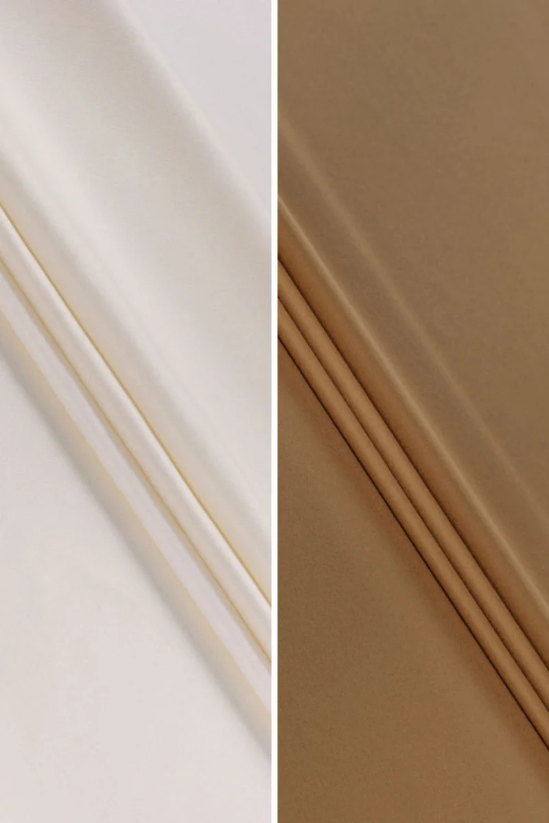Olasz 100% gyapjúszövet ekrü és teve színben. Nagyon jó minőségű anyag, puha, vékony, de átlátszatlan, rugalmatlan és finom fényű. Tökéletes klasszikus ruházathoz, például ruhákhoz, szoknyákhoz, nadrágokhoz és női kabátokhoz.