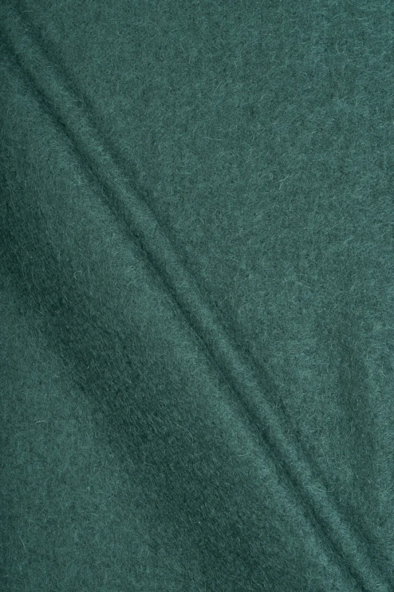 Mohairből, gyapjúból és poliamidból szőtt olasz kabátszövet kékeszöld, tompa színben. A szövet puha, vastagabb, meleg és finoman működik a szálakon. Őszi-téli anyag kabátokhoz, dzsekikhez, mellényekhez. Vegytisztítás ajánlott.