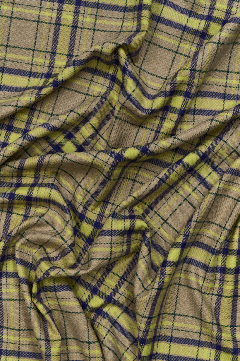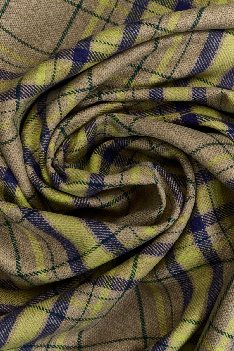 Olasz jelmezszövet az őszi-téli kollekcióból, gyapjúból és poliészterből szőtt, meleg bézs, lila és lime kockás motívummal. Nagyobb ellenőrzés rendszeres mintája - egy motívum mérete 12 cm * 11 cm. A szövet közepes vastagságú, puha, kellemes tapintású és rugalmas, sima szövésű. Időtlen ajánlat, amely tökéletes lesz szoknya, ruha, nadrág és kabát varrásához.