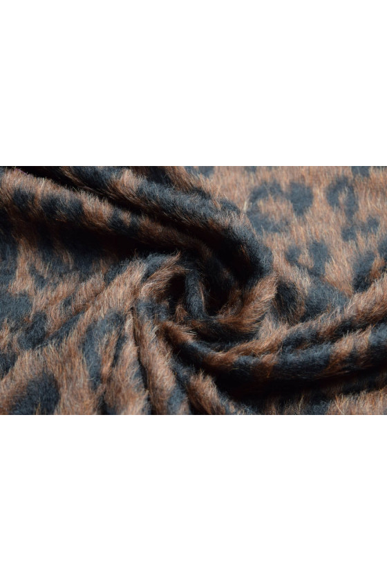 Olasz kabátszövet világosbarna, fekete leopárdmintás motívummal, az anyag rövid hajú. Tökéletes kabátokhoz és dzsekikhez.