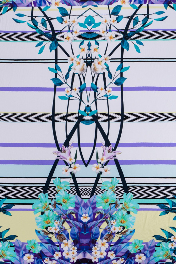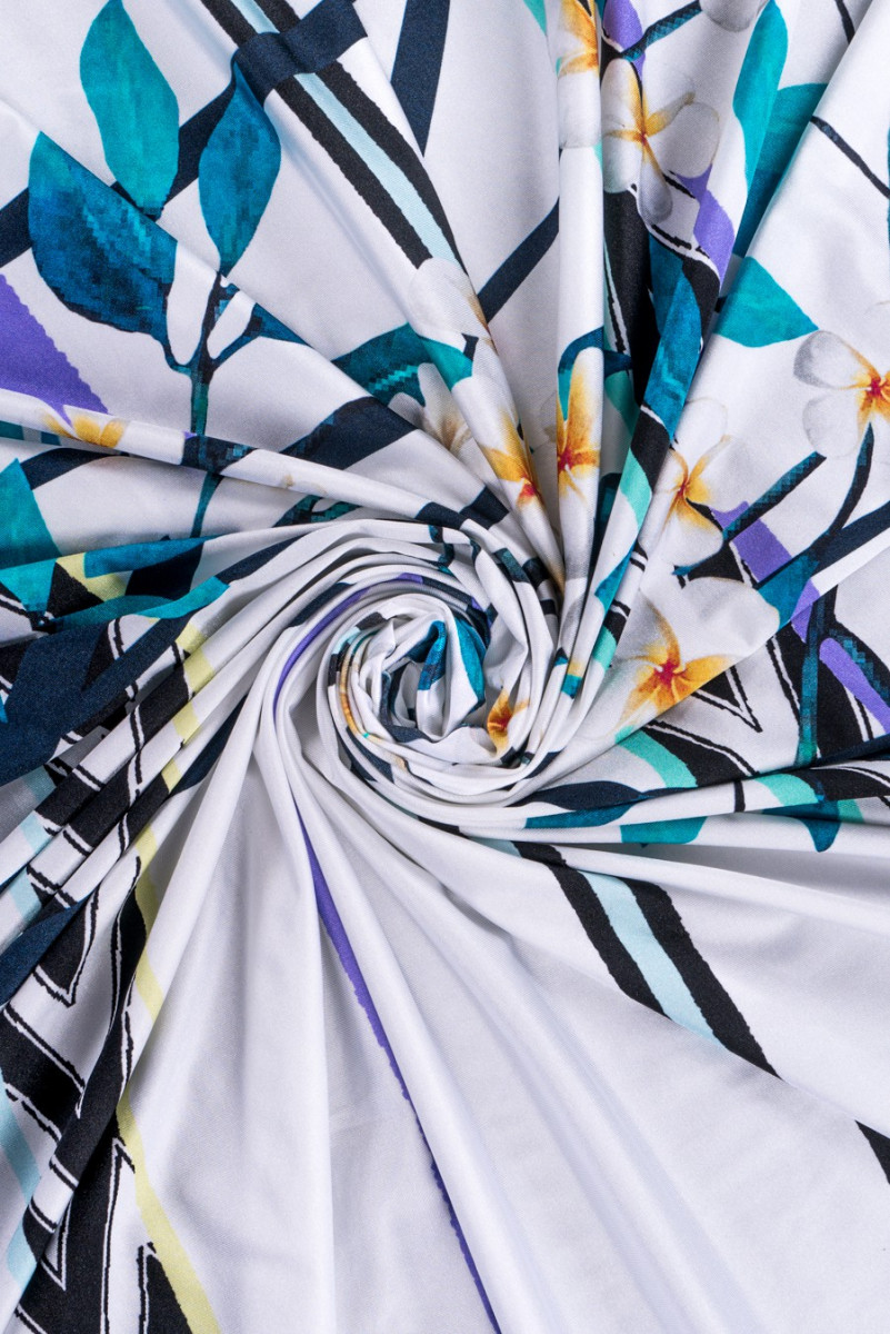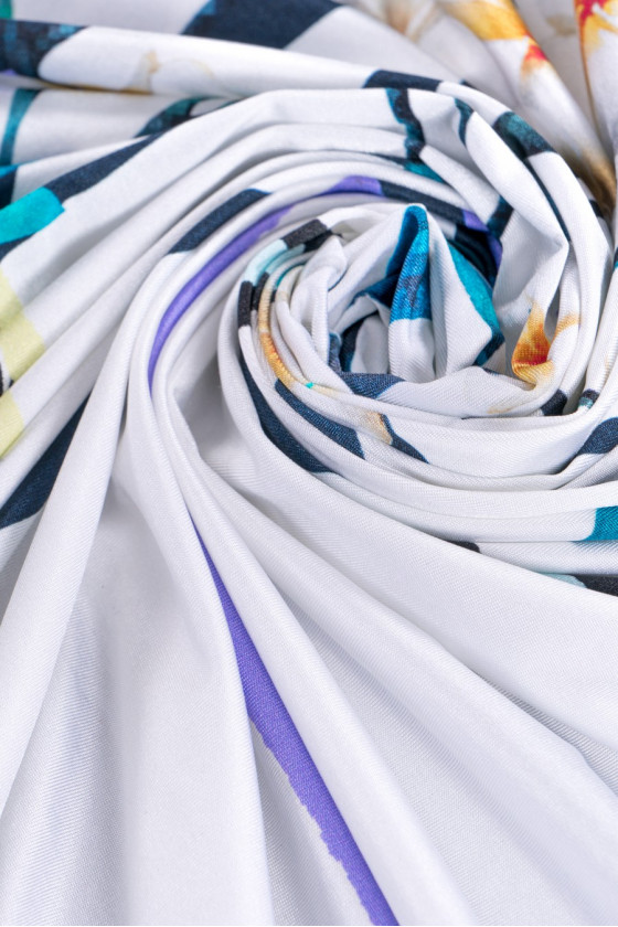 Olasz rugalmas lycra kötött anyag 135 cm* 140 cm méretű kuponban. Fehér kötött anyag, növekvő, színes virágmintával, a kupon alja 35 cm széles dekoratív szegéllyel van ellátva. Sűrű, sima szövésű, hűsítő hatású anyag, nagyon rugalmas - tökéletes azok számára, akik szeretik a testet átölelő ruhákat és az eredeti virágmotívumokat. Tökéletes mindennapi ruhák, fürdőruha vagy strandterület varrására, mivel kényelmes és gyorsan szárad.