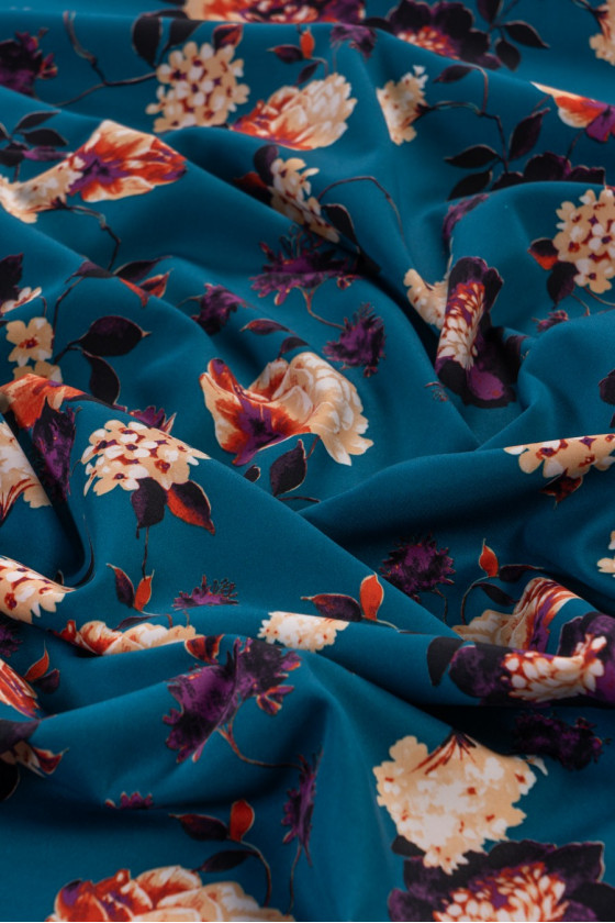Wetsuit típusú kötött szövet (búvár) tengerkék színben, őszi virágokkal. A szövet rugalmas, matt, lágyan drapériák.