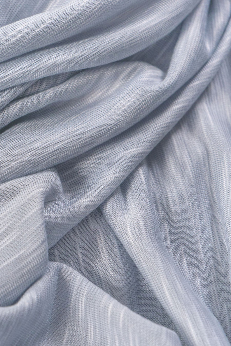 Olasz viszkóz kötött anyag szürke-kék (melange) - nagyon jó minőségű. Érdekes szövés, amely vászonra hasonlít. Húsos, rugalmas, enyhe fényű. Tökéletes blúz vagy póló varrásához. Zsugorodás +- 10%