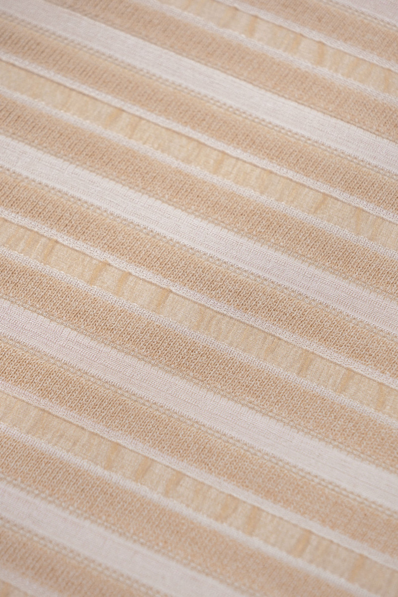 Olasz viszkóz kötött szövet lazac színben, 1 cm széles csíkokkal, váltakozva fényes és matt.