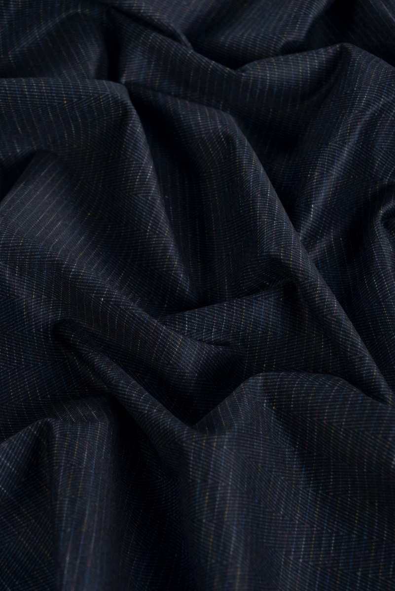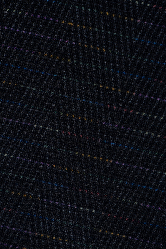 Olasz mez kötött anyag fekete színben, színes csíkok motívumával. A Jersey kötött anyag sűrű szövésű, rugalmas, lágyan drapériás fedőszövet, amely béleletlenül varrható. Nagyszerű mindennapi ruhákhoz, szoknyákhoz, kabátokhoz vagy nadrágokhoz.