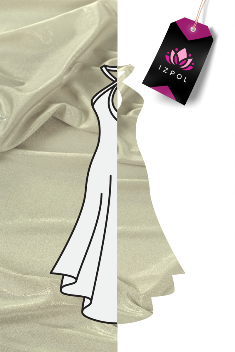 Olasz poliészter kötött hideg bézs színű, vékony ezüstszálral, amely fényes ragyogást eredményez. Rugalmas, nehéz, áramló kötött anyag - tökéletes estélyi blúz vagy ruha varrásához.