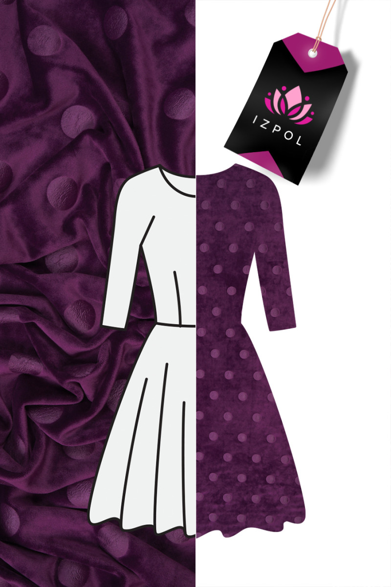 Olasz velúr kötött anyag lila színben, nagy pöttyös motívummal (2,5 cm). Rugalmas, húsos kötött anyag, jellegzetes, rövidebb halom. Tökéletes blúz, pulóver, ruha vagy nadrág varrásához.