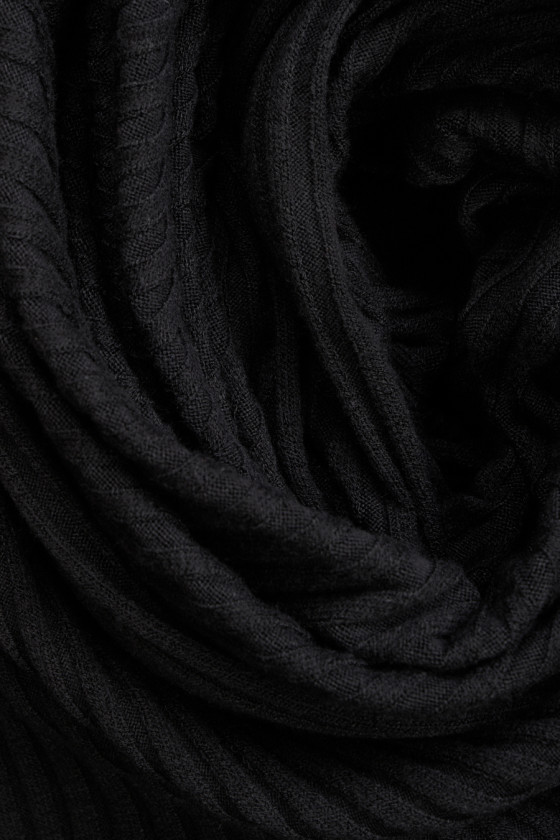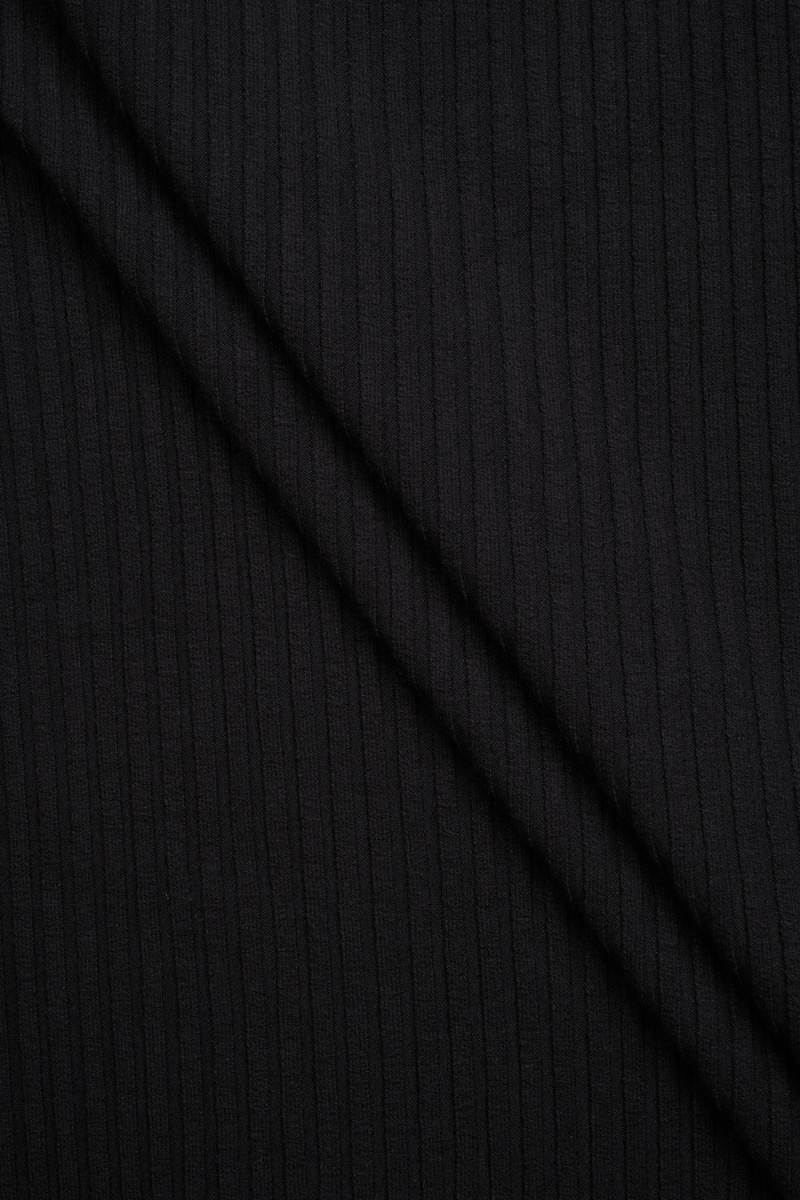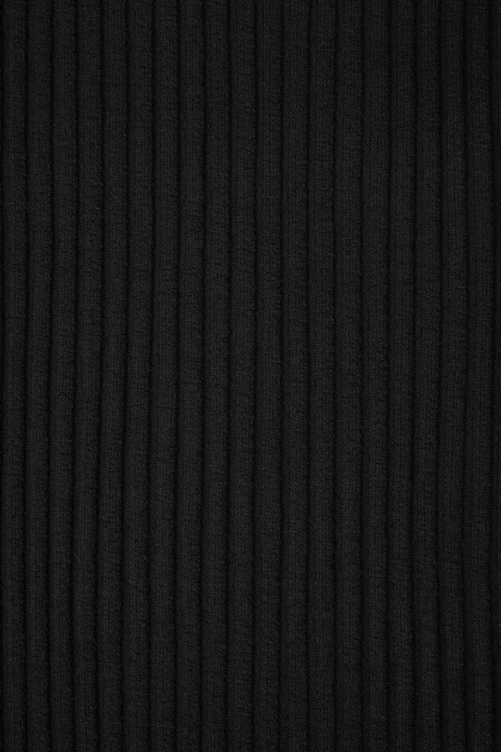 Olasz kötött anyag széles bordás szövéssel (0,5 cm) fekete színben. A kötött anyag puha, nagyon rugalmas, átlátszatlan, kellemes tapintású.