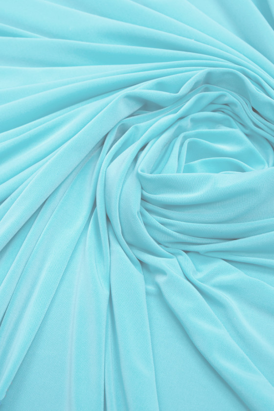 Olasz poliészter kötött anyag világos türkizkék színben. Kötött anyag kompakt, sima szövéssel, mindkét irányban rugalmas, a jobb oldalon kissé fényes.