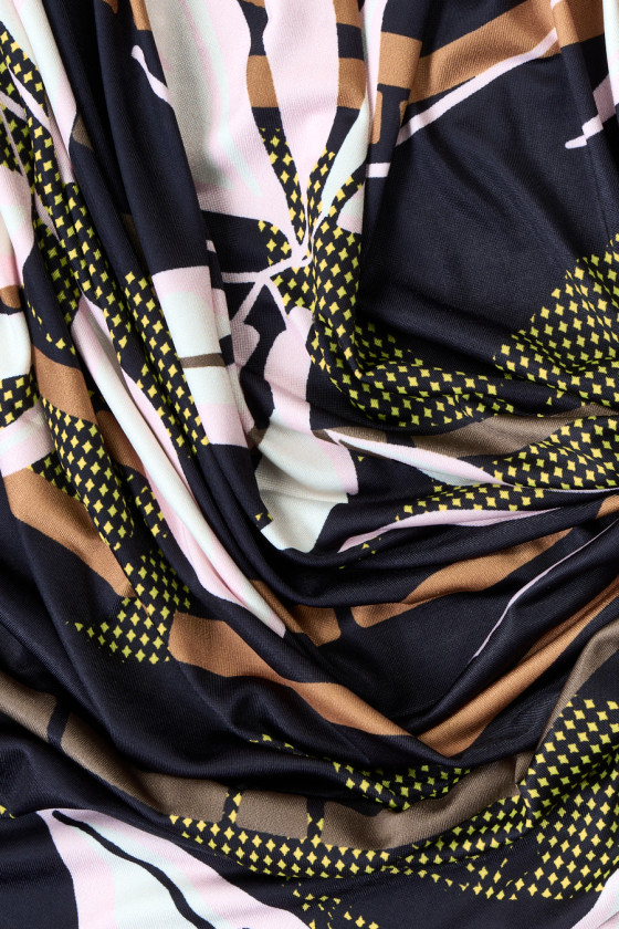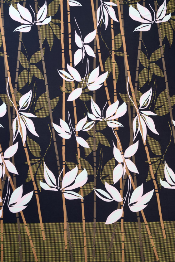 Olasz poliészter kötött anyag, bambuszoszlopok, világos rózsaszín virágok és zöld levelek mintájával fekete alapon. A kötött anyag rugalmas, tapintásra hű, átlátszatlan, finom ragyogással készült - a kerület köré varrjuk. Érdekes javaslat ruha vagy szoknya létrehozására.