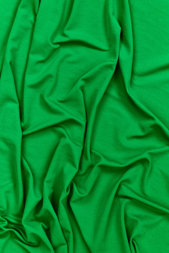 Olasz viszkóz kötött anyag zöld georgette szövéssel. A szövet matt, húsos, rugalmas, áramló és hűvös tapintású. Kiváló lehetőség nyári ruházathoz, például ruhákhoz, szoknyákhoz vagy blúzokhoz, jól illeszkedik a felszerelt ruhákhoz.