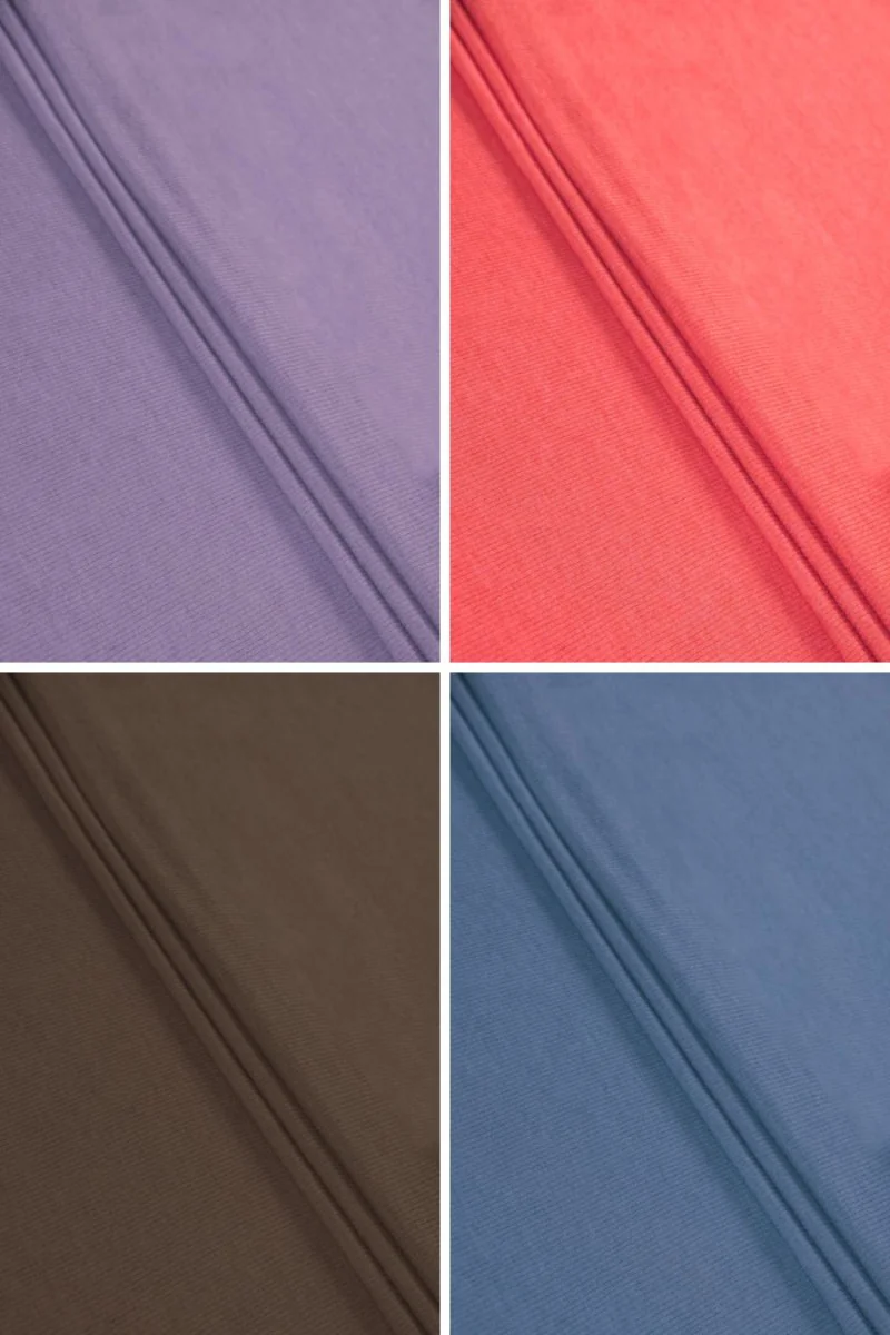 Olasz pamut-viszkóz kötött anyag különböző színekben, finom csíkkal. A kötött anyag vékony, de átlátszatlan, puha, rugalmas és matt. Blúzokhoz, pólókhoz és felsőkhöz ajánljuk.