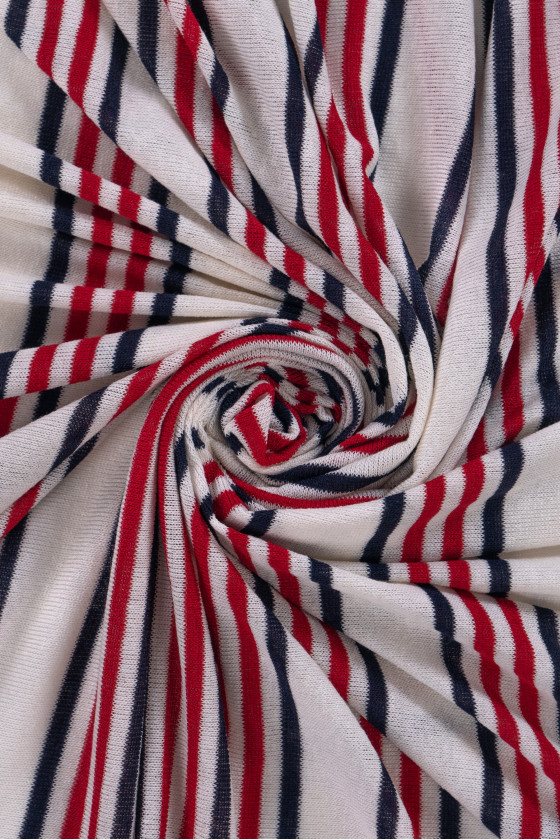 Olasz viszkóz kötött anyag piros és sötétkék csíkokkal krém alapon.