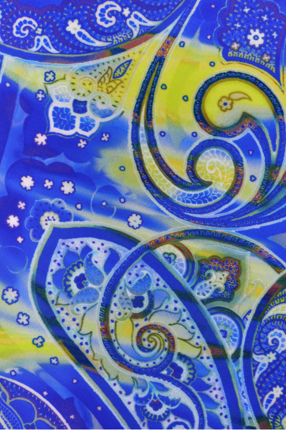 Olasz rugalmas lycra kötött anyag búzavirágkék színben, áttört sárga színnel és keleti paisley motívummal. Kompakt, sima szövésű, nagyon rugalmas szövet - ideális azok számára, akik szeretik a testet átölelő ruházatot és a keleti mintákat. Tökéletes mindennapi ruhák és fürdőruhák varrására, mivel kényelmes és gyorsan szárad.