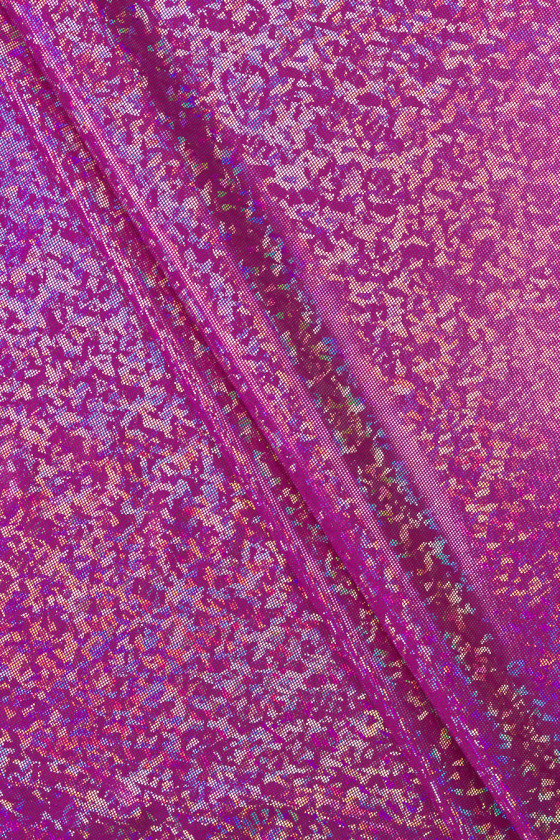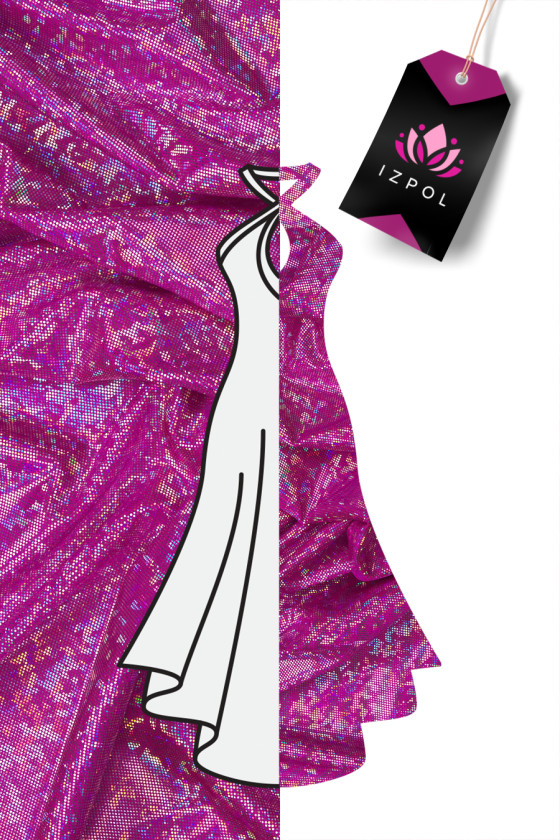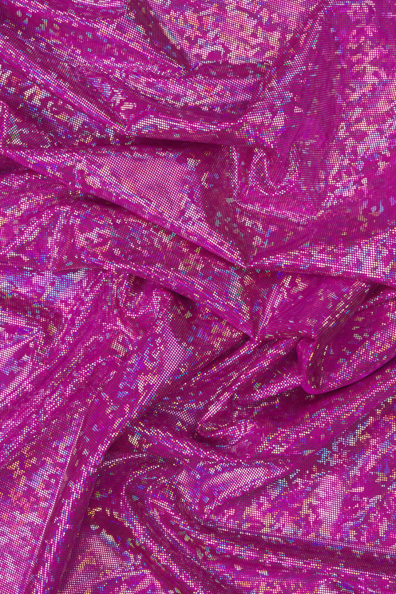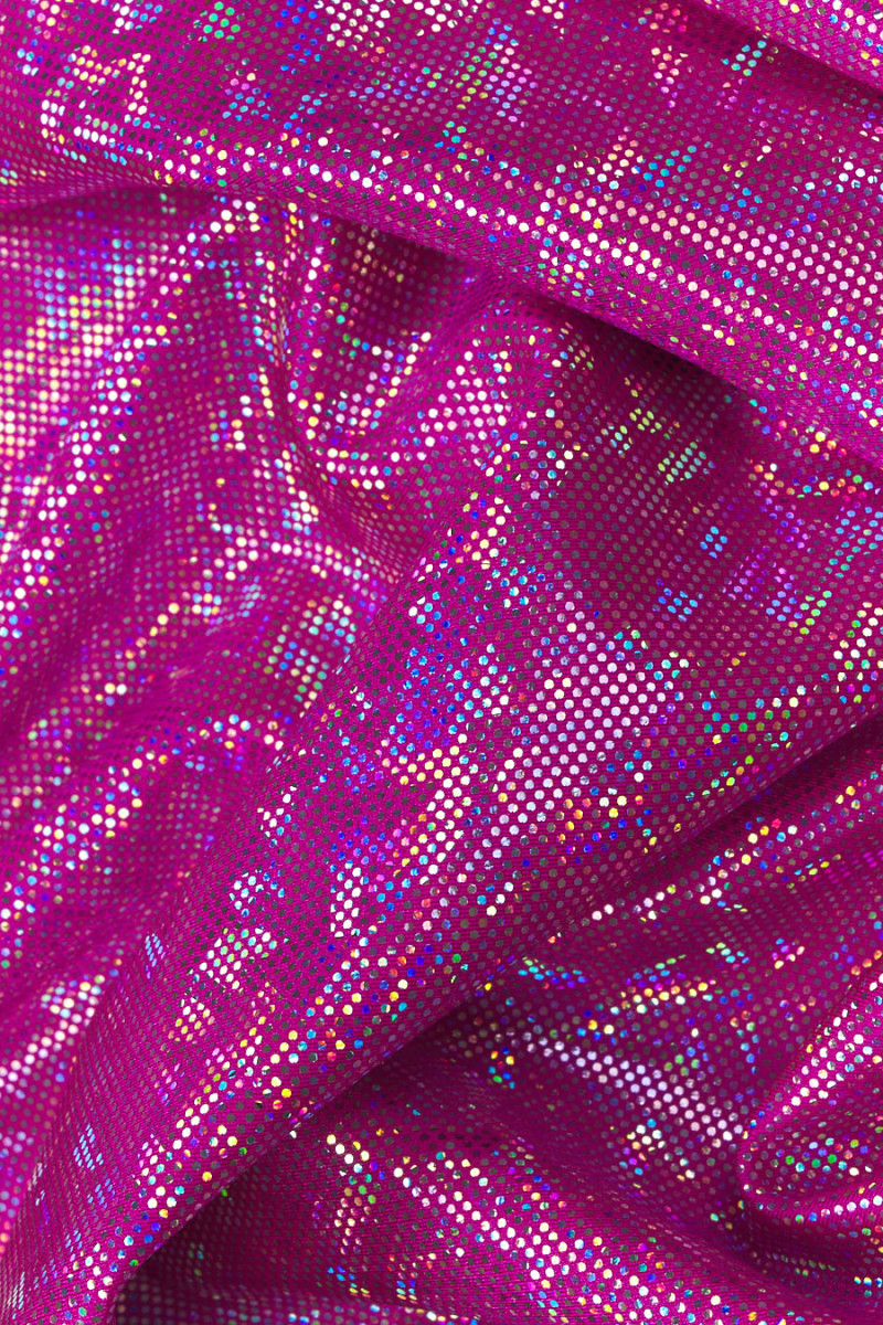 Olasz rugalmas lycra kötött anyag a legdivatosabb fukszia színben több évszakban, ezüst és multi csillogással (nem esik le), ami "pixelekre" emlékeztető mintát hoz létre. Sűrű, feszes szövésű, nagyon rugalmas szövet - ideális azok számára, akik szeretik a testhez illeszkedő ruházatot. Kiválóan alkalmas tánc- vagy estélyi ruhák, valamint fürdőruhák varrására, mivel kényelmes, gyönyörűen fényes és gyorsan szárad.