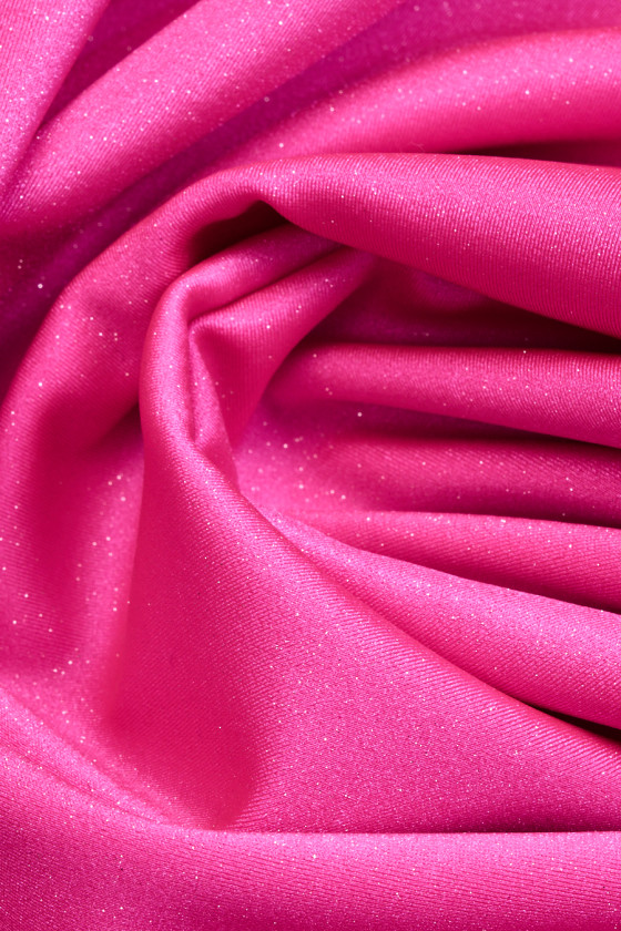 Rugalmas lycra kötött anyag neon rózsaszínben, ezüst csillogással (nem esik le). Sűrű, feszes szövésű, nagyon rugalmas szövet - ideális azok számára, akik szeretik a testhez illeszkedő ruházatot. Kiválóan alkalmas tánc- vagy estélyi ruhák, valamint fürdőruhák varrására, mivel kényelmes, gyönyörűen fényes és gyorsan szárad.