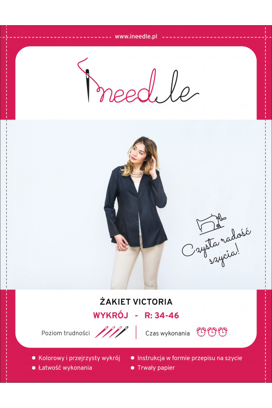 Egy divatos, derékhangsúlyozó kabát / kabát mintája, amely tökéletes befejezése lesz mind a hétköznapi, mind a klasszikusabb stilizációknak. A Victoria kabátot nadrággal, szoknyával és akár ruhákkal is viselheti. A tökéletesen elrendezett és címkézett minta segít varrni egy Victoria kabátot 34 és 46 közötti méretben. A divatos Victoria kabát egyenes szabású, csípőig érő és hosszú ujjú. Finom, gyakorlatilag láthatatlan horoggal van rögzítve. Az oldalsó vágások finoman hangsúlyozzák a derékot, ami az alak finomításának hatását adja.