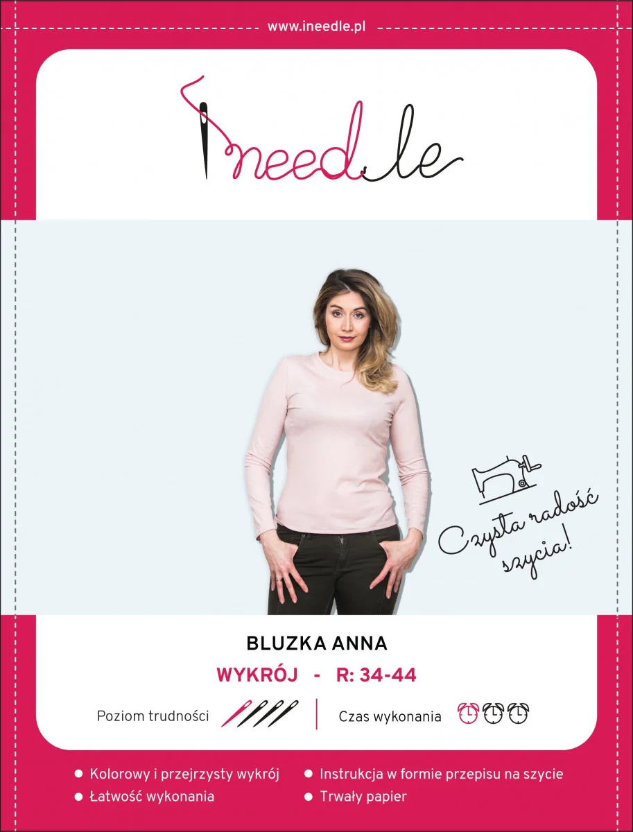 Egy klasszikus, alapblúz mintája, amely mindenhez passzol, és attól függően, hogy milyen anyagból varrjuk, elegánsabb vagy hétköznapibb lehet. Egy egyszerű és nagyon olvasható minta segít kétféle alapblúz varrásában; hosszú vagy rövid ujjú, 34-44-es méretben. Használjon kellemes tapintású kötött anyagot, és játsszon a színekkel. Ez a blúzmodell rövid és hosszú ujjal is varrható (mindkét változat elérhető a mintán). Az Anna blúz szó szerint mindenhez passzol. Tökéletes lesz kabát, kardigán vagy pulóver alá, de önálló öltözékként is tökéletes lesz. Az Anna blúz mintája az alakhoz illeszkedik, hossza pedig a derék körül ér.