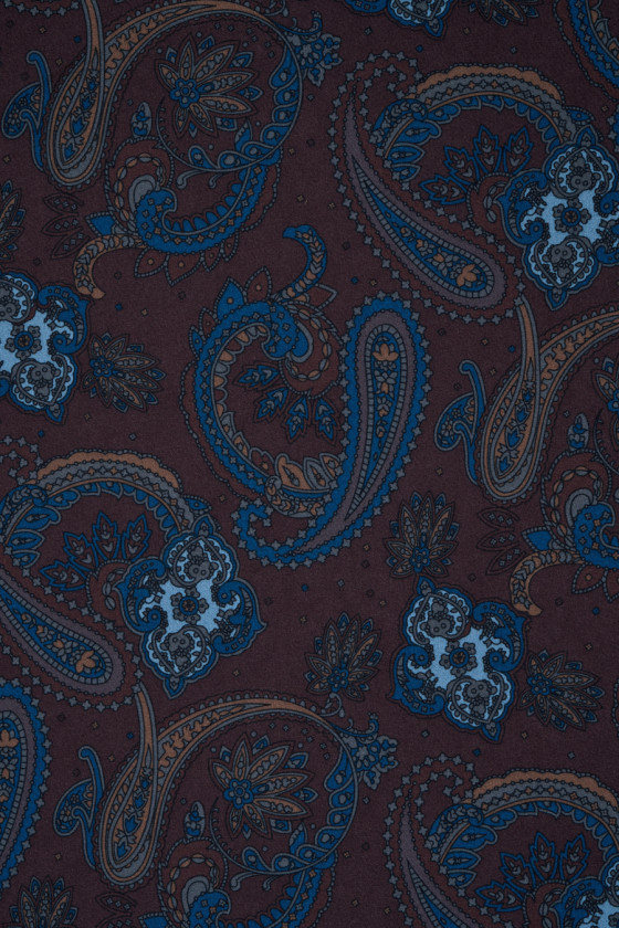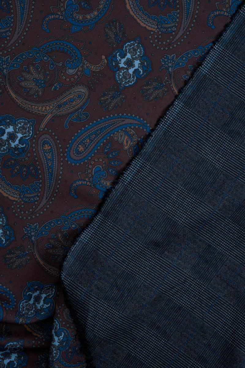Eredeti kétoldalas kötött anyag - egyik oldalon pasley minta barna és sötétkék színben, másrészt sötétkék és szürke csekk.