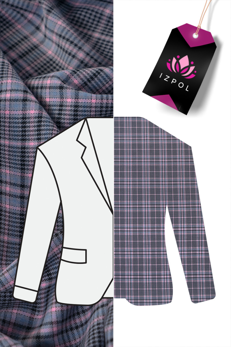 Olasz jelmezszövet kockás motívummal szürke, fekete, rózsaszín és kék színben. Puha, enyhén rugalmas őszi-téli szövet.