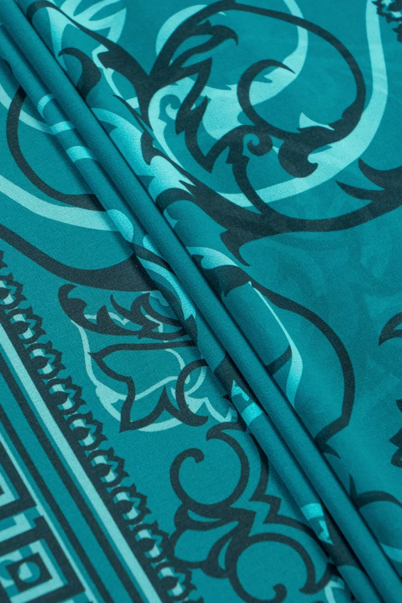 Poliészter sifon egy jól ismert divattervezőtől. Divatos, keleti motívum fekete színben, tengeri - zöld alapon. 120 cm*145 cm méretű kuponban érkezik.