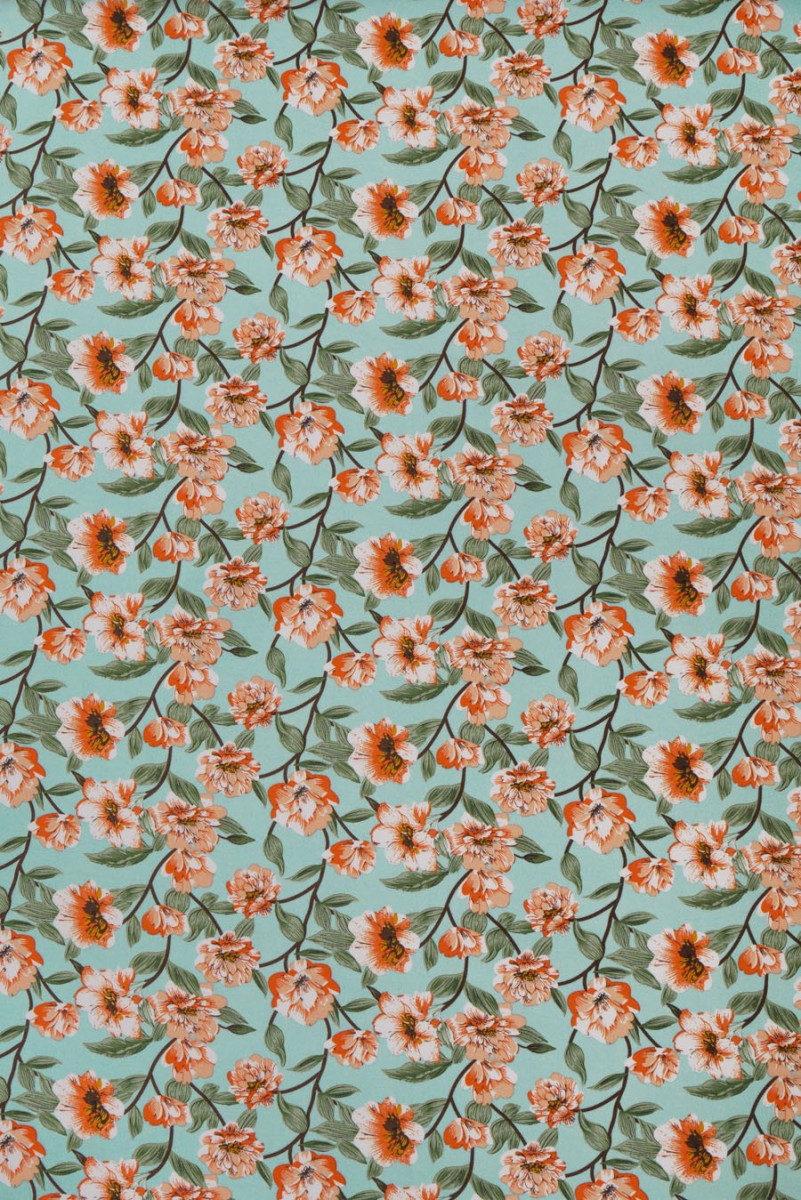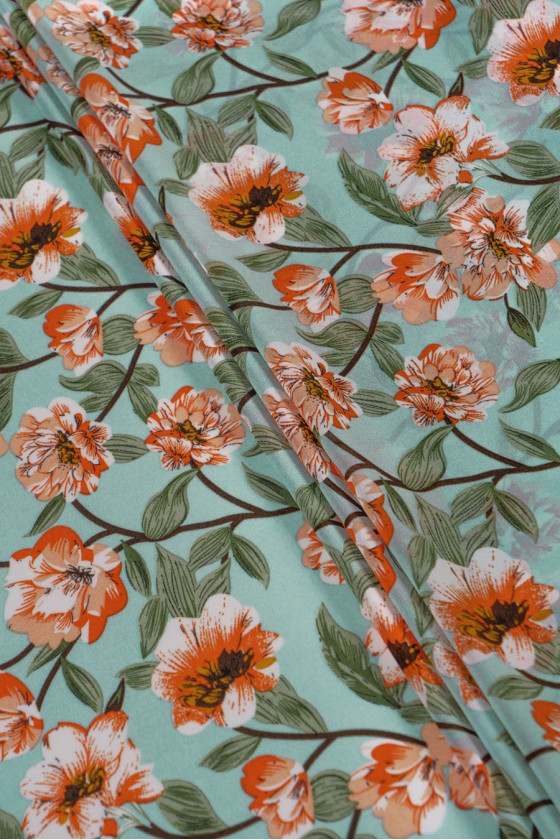 Olasz poliészter georgette - menta narancssárga virágokkal. Vékony (átlátszó), áramló, nem rugalmas anyag - tökéletes ruha, szoknya, tágas blúz varrásához. A szövet bélést igényel.