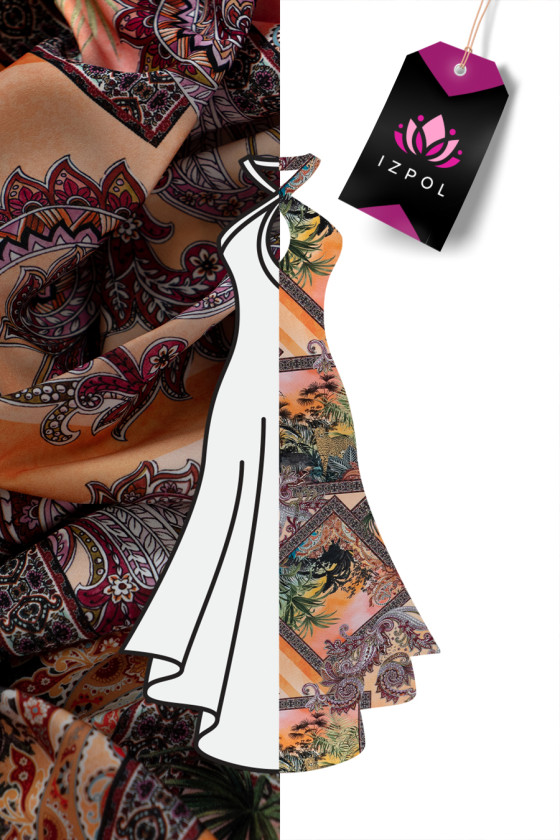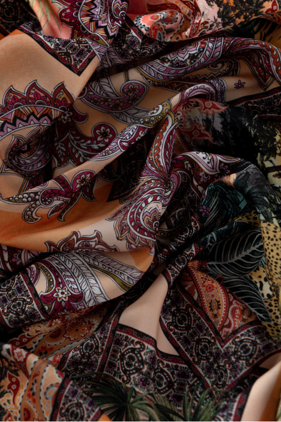 Olasz poliészter krepp keleti és állati motívumokkal a vörös árnyalataiban. A krepp finom, vékony, félig matt anyag. Puha tapintású és nagyon jól illeszkedik.