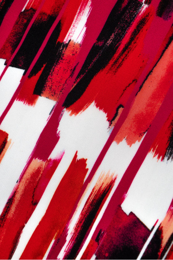 Olasz poliészter twill szövet színes mintákkal, rózsaszín, piros, fekete és fehér árnyalatokban. A Twill egy twill szövésű anyag, puha, nagyon tartós, finoman merev, hogy illeszkedjen. Tökéletes ing, ruha, szoknya vagy kendő/sál varrásához.