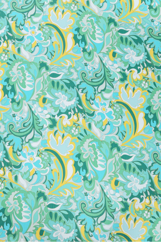 Olasz poliészter sifon, zöld és türkiz, díszes virág- és levélmotívumokkal gyűrött. A gyűrött sifon egy vékony, átlátszó, tágas, finom anyag, érdekes, gyűrött szerkezettel.