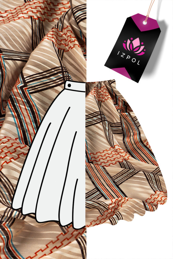 Olasz devore poliészter sifon bézs színben, fekete-piros-kék twill motívummal (19 cm). A devore szövet a sifon és a további, szatén csíkok kombinációja. A szövet vékony, átlátszó, nem rugalmas, nagyon finom. Tökéletes szellős blúz, szoknya, ruha vagy kendő varrásához.