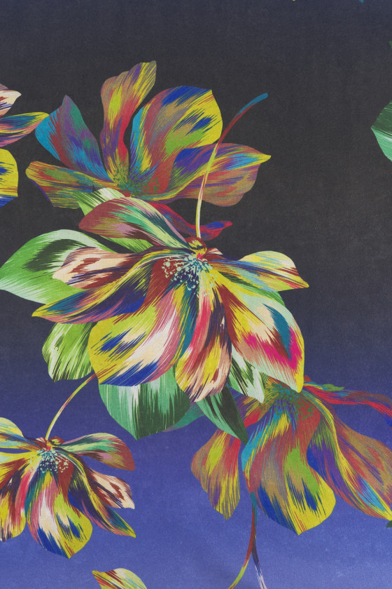 Olasz poliészter sifon nagy, színes virágok motívumával, sötétkék árnyalatú háttéren. A szövet vékony, átlátszó, könnyű és tágas, nem rugalmas.
