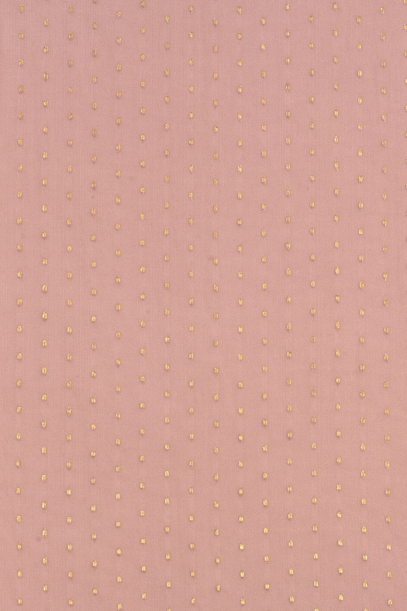 Olasz poliészter sifon piszkos rózsaszínben, aranylurex szálból készült kis, geometriai minták motívumával. Az anyag vékony és áramló, így tökéletes egy tágas ruha, blúz vagy kendő varrására. Fantasztikus ajánlat a tompa, enyhén fényes szövetek rajongóinak.