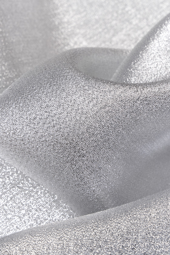 Olasz poliészter organza szövet ezüst színű. A szövet vékony, enyhén átlátszó, merev, intenzív ezüst ragyogással. Ideális ajánlat egyedi estélyi ruha, például ruha, szoknya és díszítőelem létrehozására.