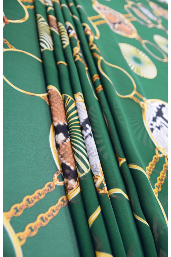 A díszes ékszermintával ellátott poliészter sifon (12-15 cm átmérőjű körök) nagyon finom, tágas, átlátszó anyag. Tökéletes tágas ruhákhoz, szoknyákhoz, blúzokhoz vagy pareókhoz. Nem rugalmas anyag. Színek: palack-zöld alapon