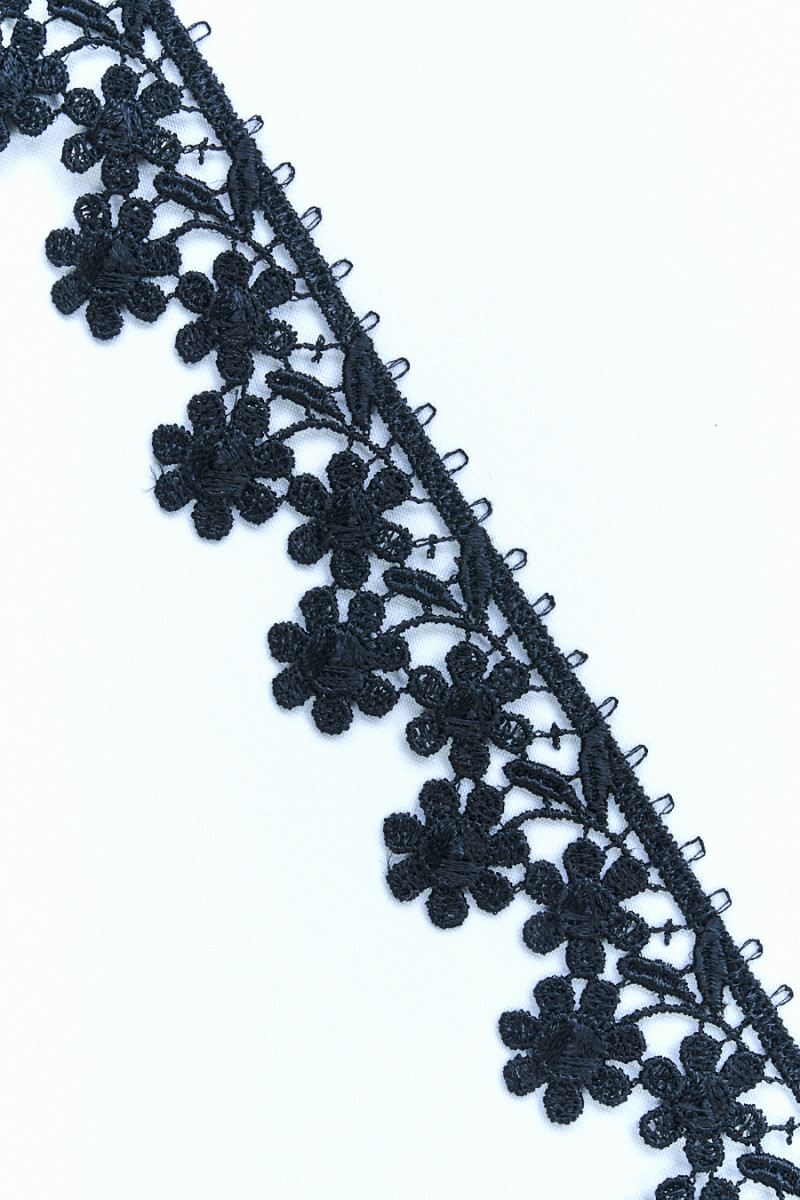 Olasz rövidáru szalag - guipure fekete, 3 cm széles. A kis virágok és levelek gyönyörű motívuma, amely a tetején csíkkal van összekötve. Fantasztikus ajánlat sima szövetek befejezéséhez.