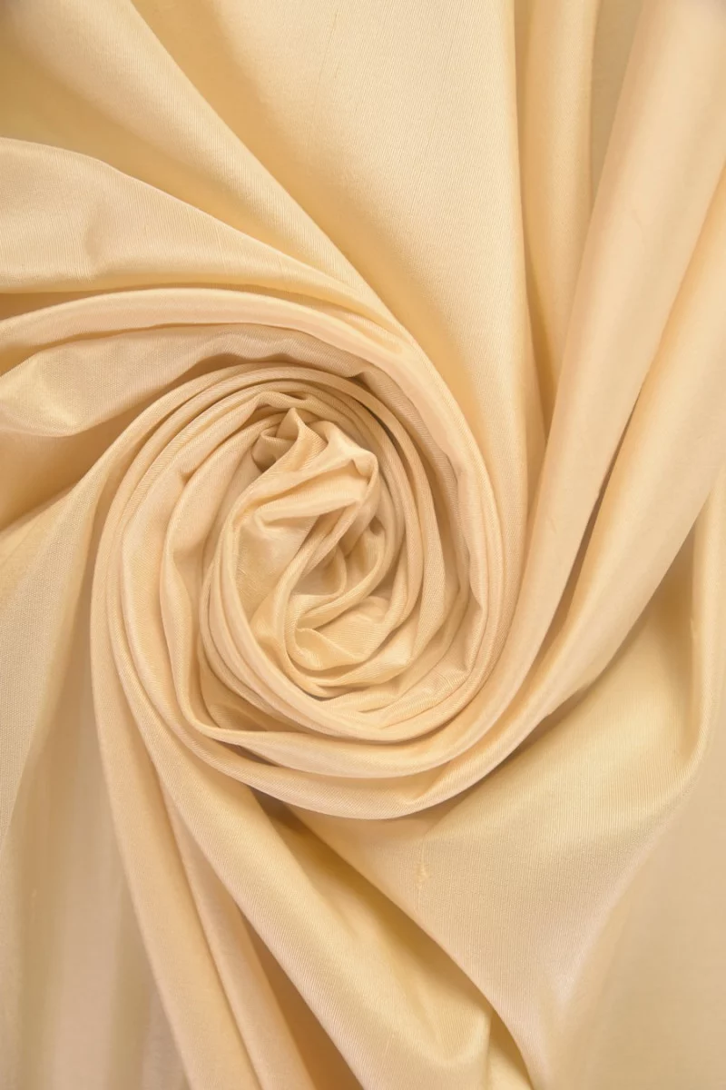 A sima szerkezetű, világos bézs színű taftra emlékeztető Shantung selyem lazán szőtt anyag, természetesen festett. Enyhén merev, műanyag szerkezetű. Alkalmas ruhákhoz és belsőépítészethez - függönyökhöz, párnákhoz stb. Csak vegytisztítás!