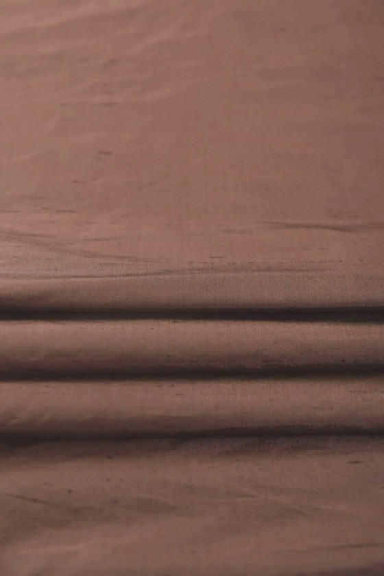 Kéttónusú shantung selyem (fekete és lazacszál) barna színű, sima szerkezetű, tafthoz hasonlító, sűrűsödéssel. Lazán szőtt anyag, természetesen festett. Enyhén merev, műanyag szerkezetű. Alkalmas ruhákhoz és belsőépítészethez - függönyökhöz, párnákhoz stb. Csak vegytisztítás!