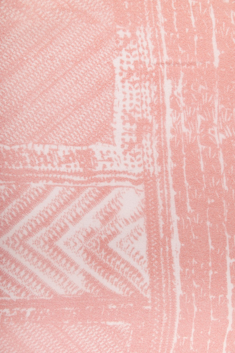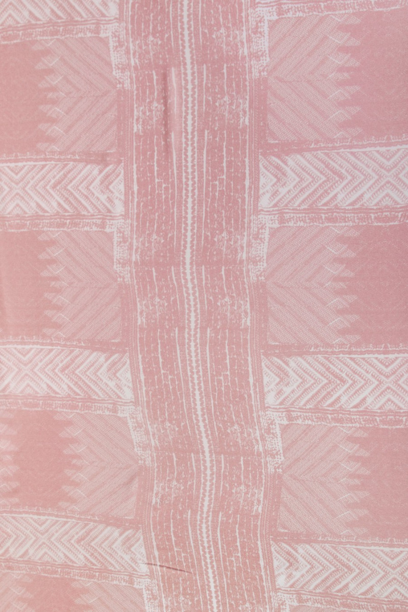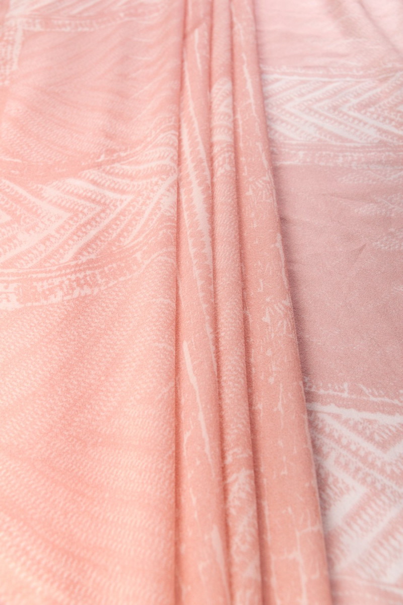 Selyem georgette por rózsaszínben, ecru-val, ismétlődő mintával 55 cm-enként, téglalapokból, átlátszó (bélést igényel). Finom anyag, amely ideális a nyári meleghez.