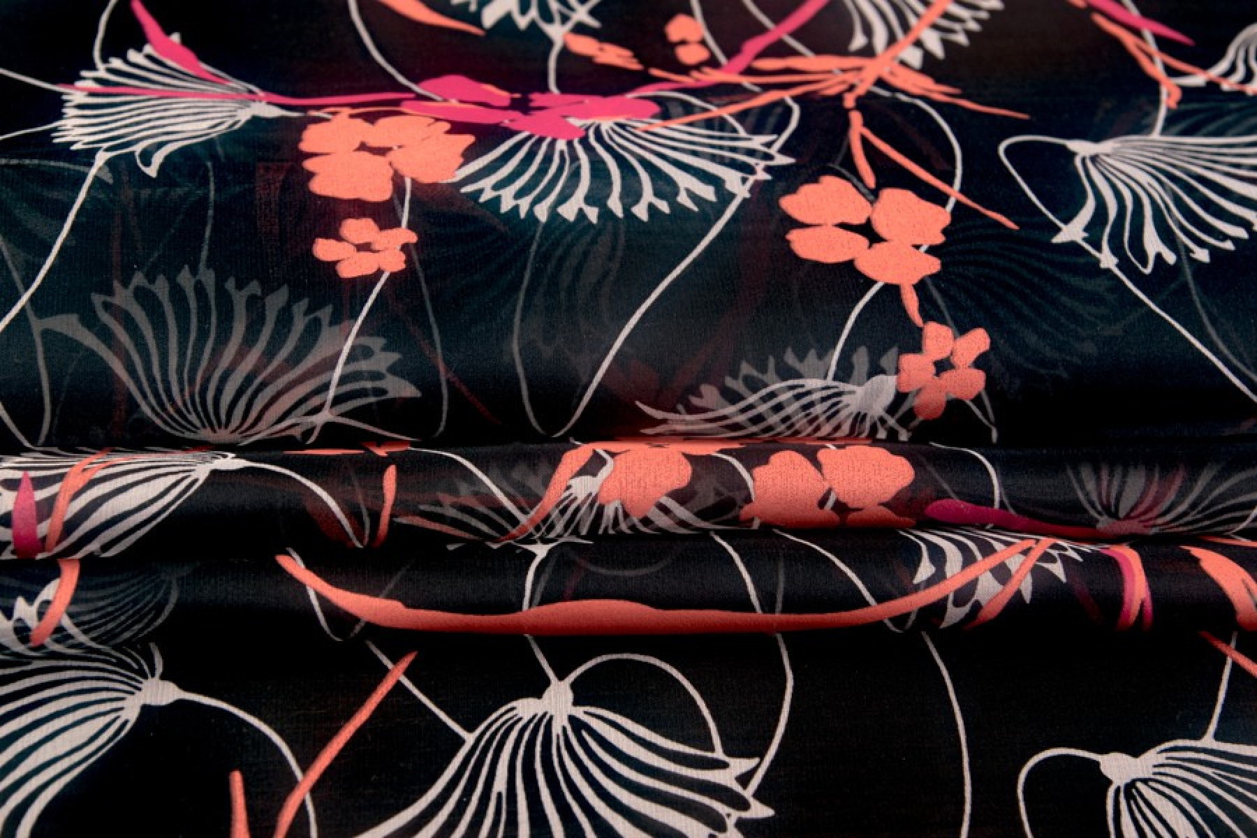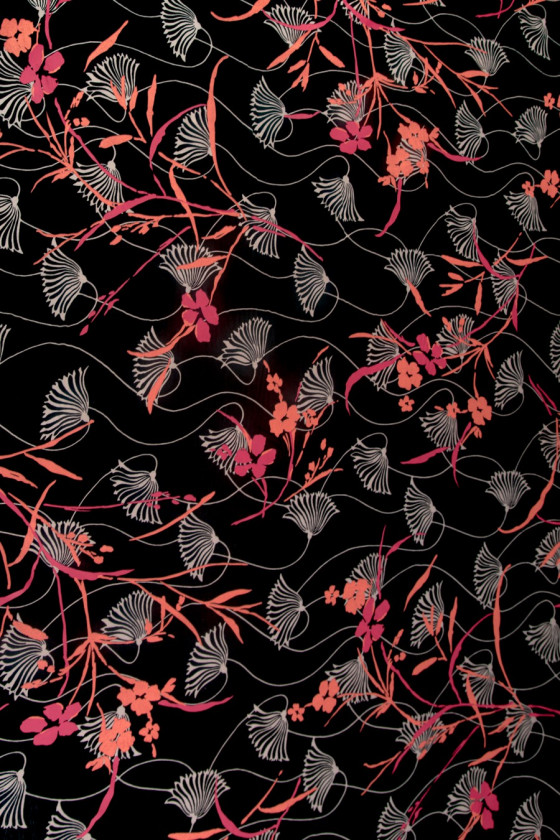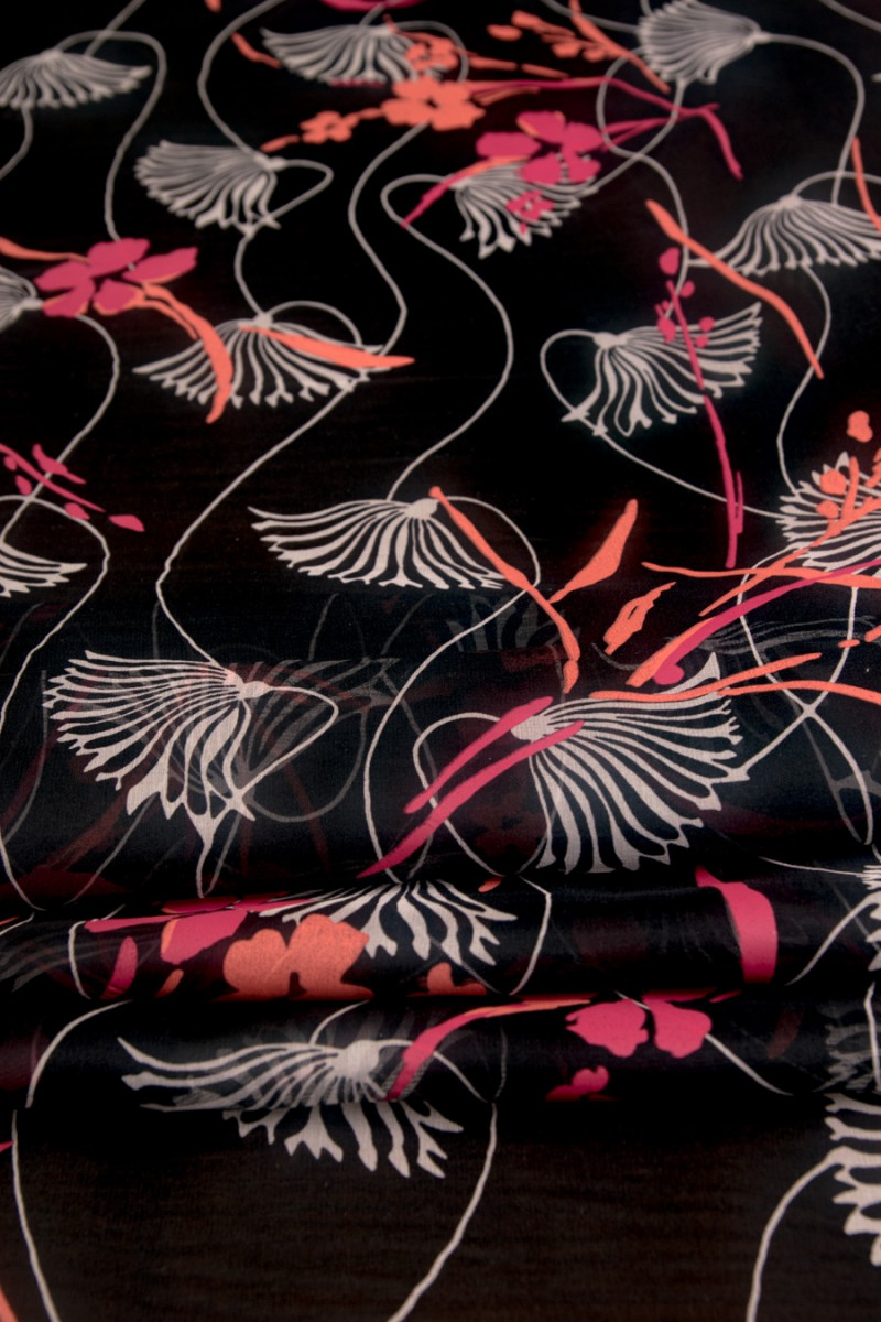 Muslin természetes selyemből, fekete színben. Minta kis virágokkal színekben, krém, korall, fukszia. A muszlin nagyon finom, tágas, átlátszó anyag (bélést igényel). Tökéletes tágas ruhákhoz és blúzokhoz. Nem rugalmas anyag.