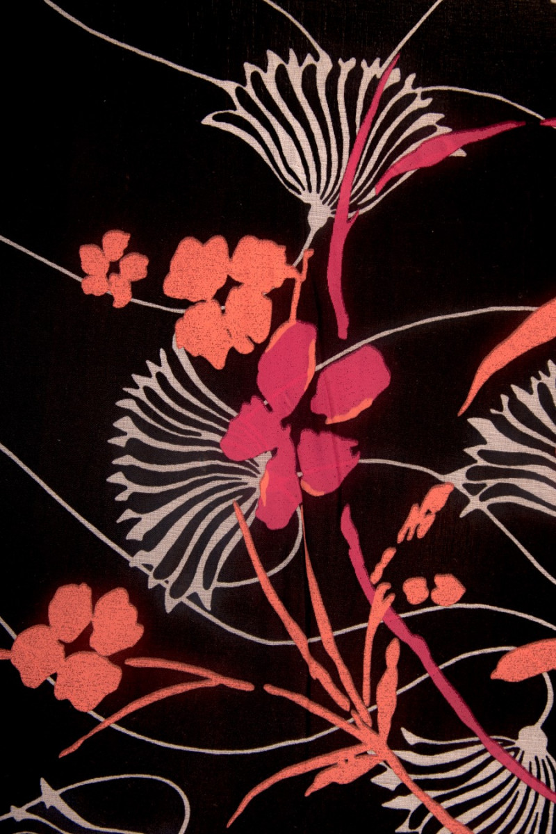 Muslin természetes selyemből, fekete színben. Minta kis virágokkal színekben, krém, korall, fukszia. A muszlin nagyon finom, tágas, átlátszó anyag (bélést igényel).