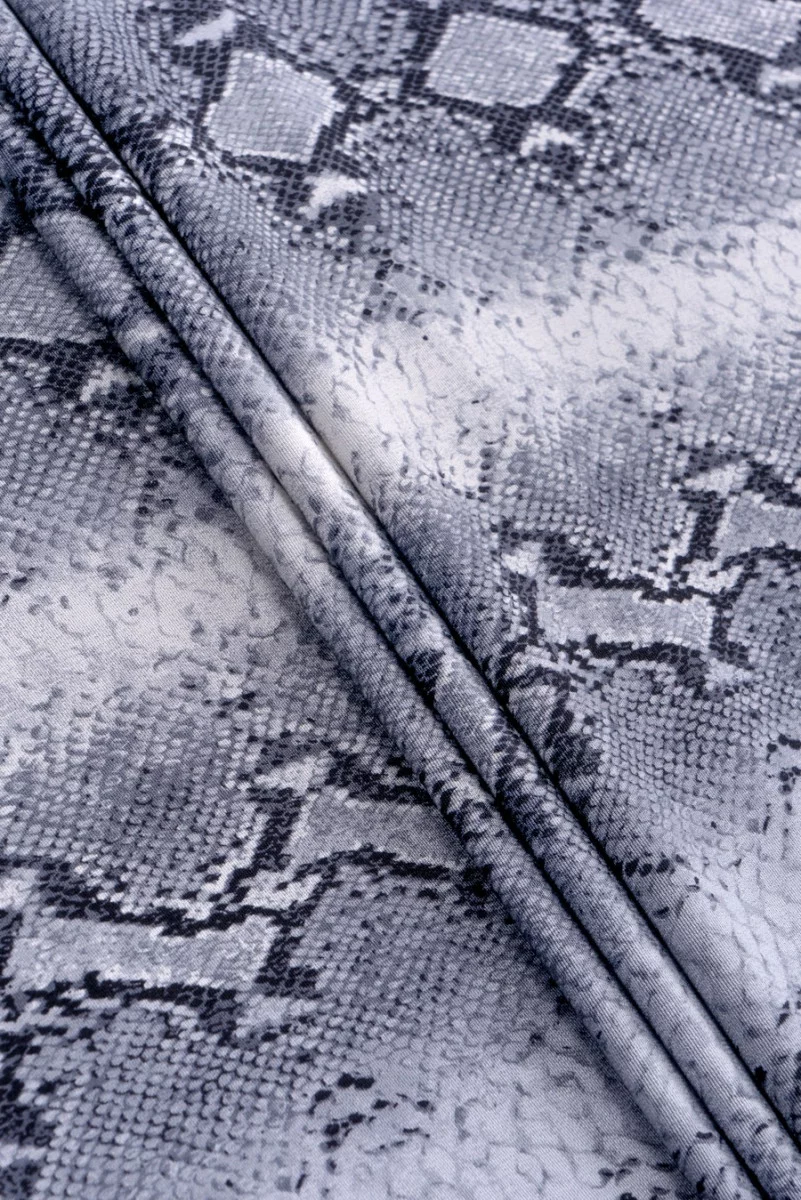 Vastagabb selyem, szürke kígyómintával, nehéz, áramló, matt anyaggal. Ruhákhoz, nadrágokhoz, szoknyákhoz ajánljuk.