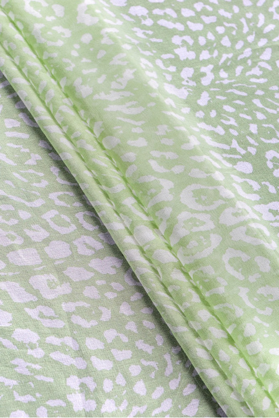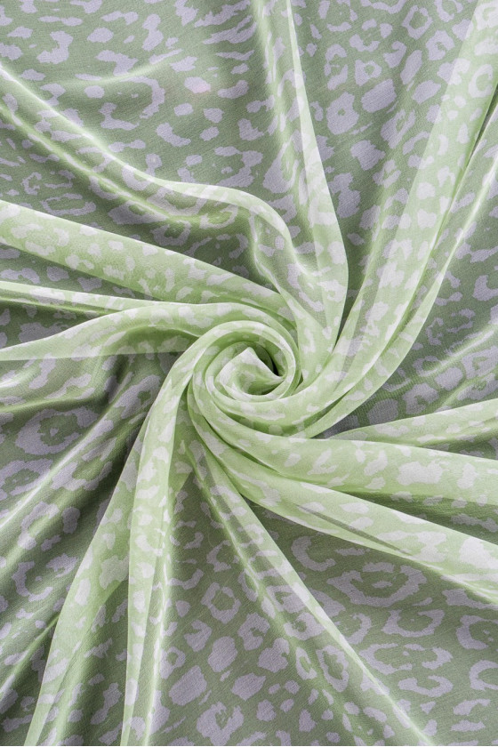 Selyem georgette zöld pisztácia színben, fehér leopárdnyomtatással. Ez egy matt, nagyon finom, félig átlátszó anyag (bélést igényel).