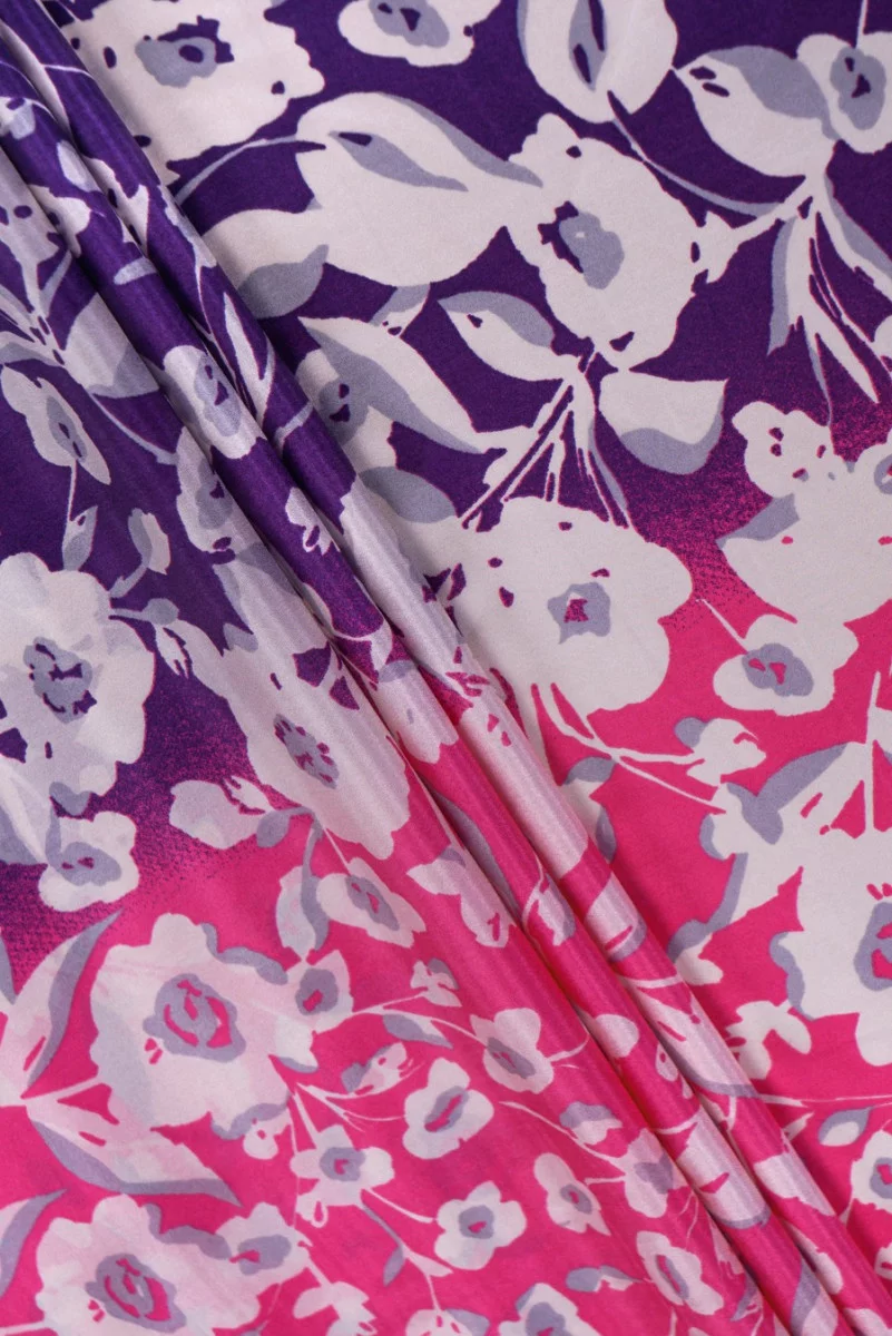 Olasz, nem rugalmas 100% habotai selyemszövet. Érdekes motívum fehér és szürke virágok rózsaszín alapon, lila színűvé válik. A minta perifériásan fordul elő.