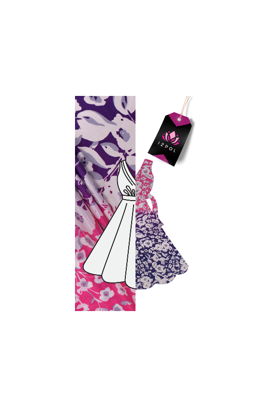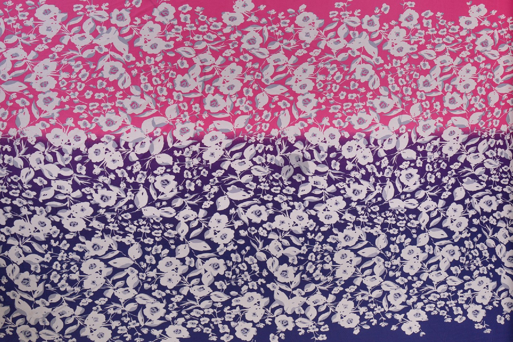 Olasz, nem rugalmas habotai selyemszövet. Érdekes motívum fehér és szürke virágok rózsaszín alapon, lila színűvé válik. A minta perifériásan fordul elő. Tökéletes tágas ruha, blúz, szoknya, kendő varrásához.