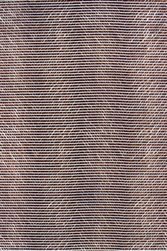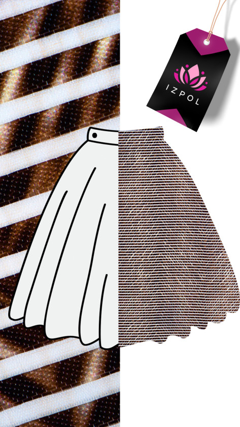 Olasz organza szövet váltakozó csíkokkal - átlátszó és átlátszatlan, 0,5 cm széles. Cikk-cakk motívum barna-bézs színben. Az átlátszó öv természetes selyemből szőtt, míg az átlátszatlan poliészterből készül. Vékony, merev anyag - tökéletes szoknya, ruha, blúz varrásához.